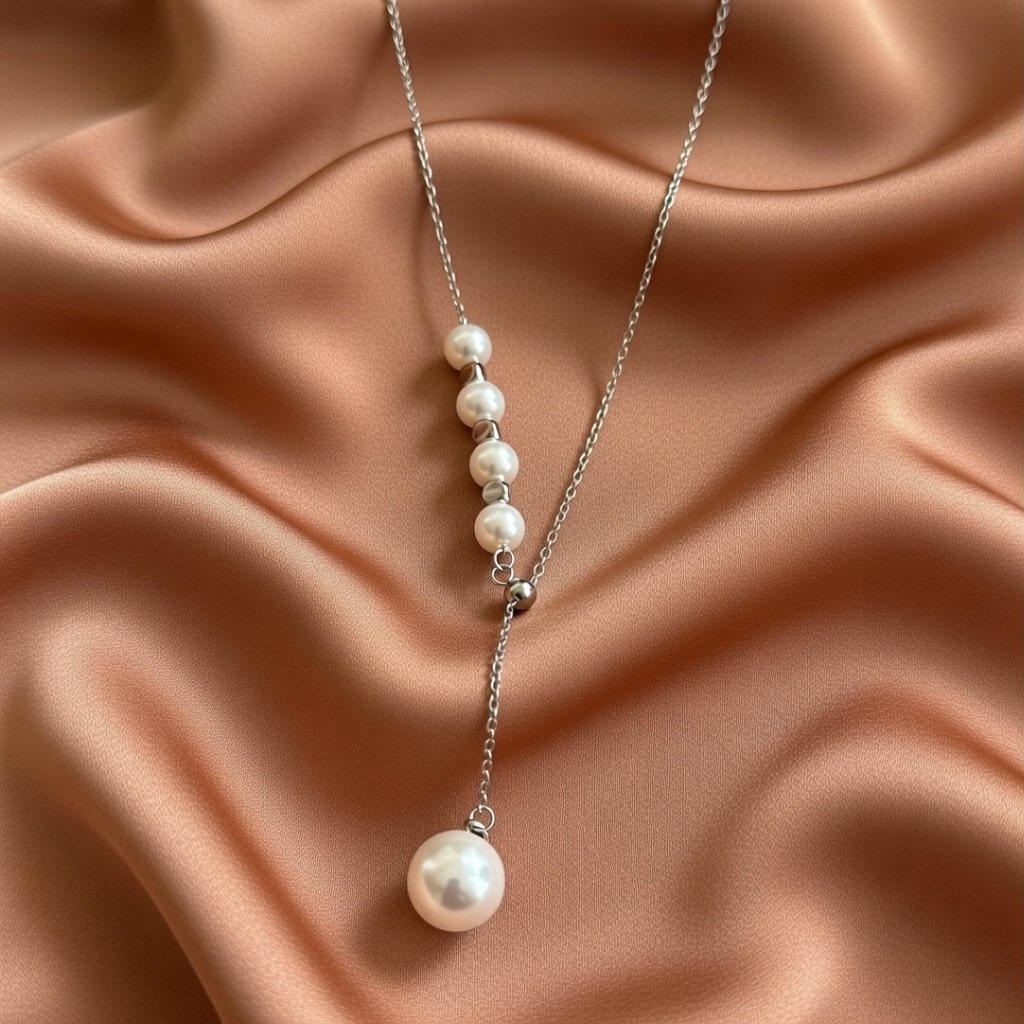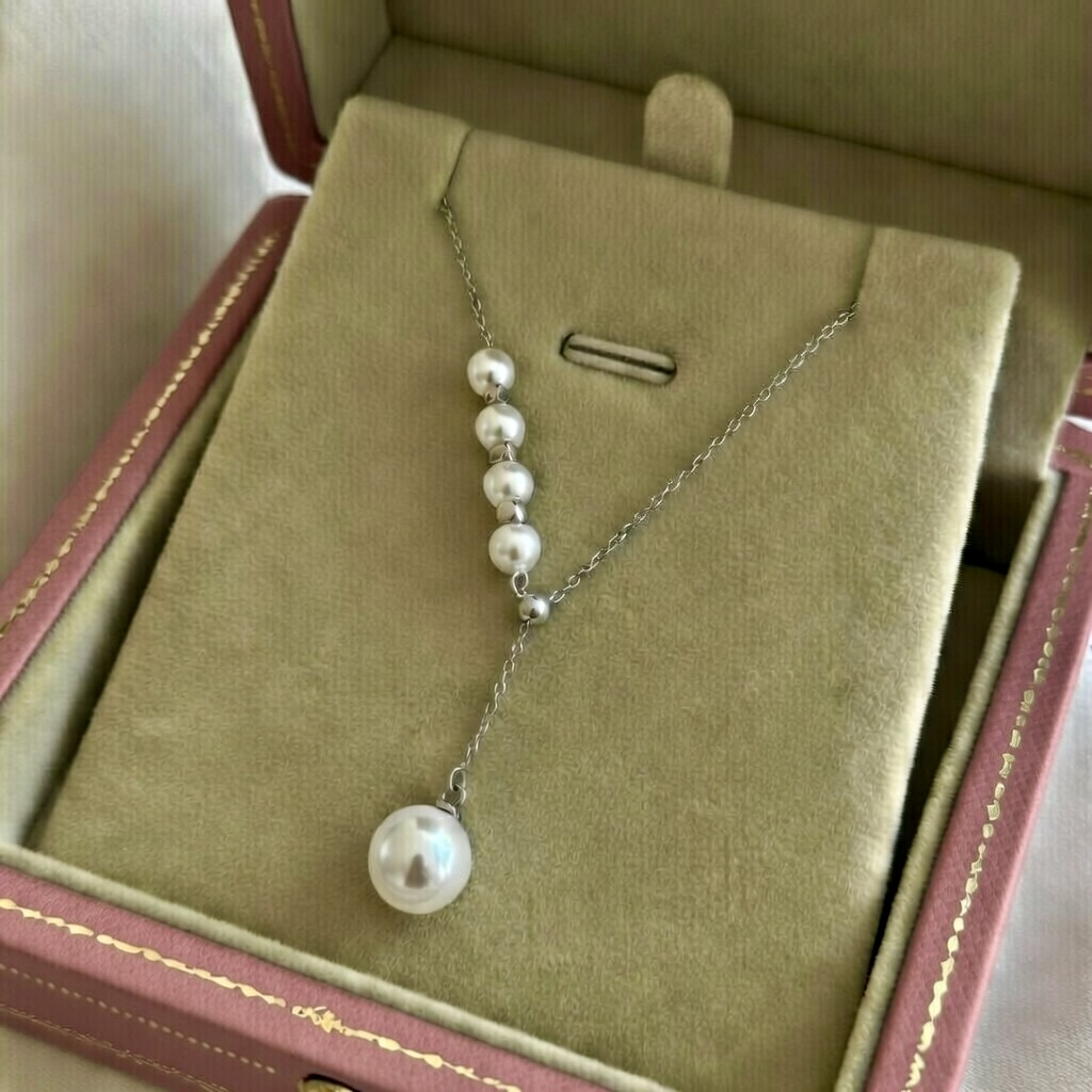 A timeless pearl drop necklace with five delicate pearls on a sterling silver chain. Perfect for adding a touch of elegance to any outfit, with a single pearl drop for a refined finish. Ideal for both special occasions and everyday wear.