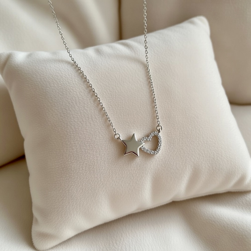 A beautiful pairing of star and heart pendants on a single chain, symbolizing love and dreams that shine bright.