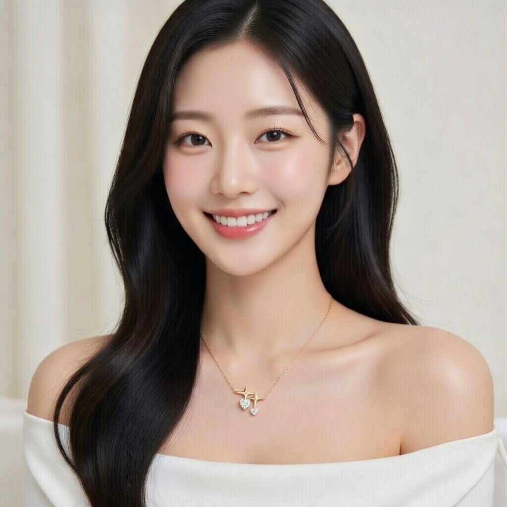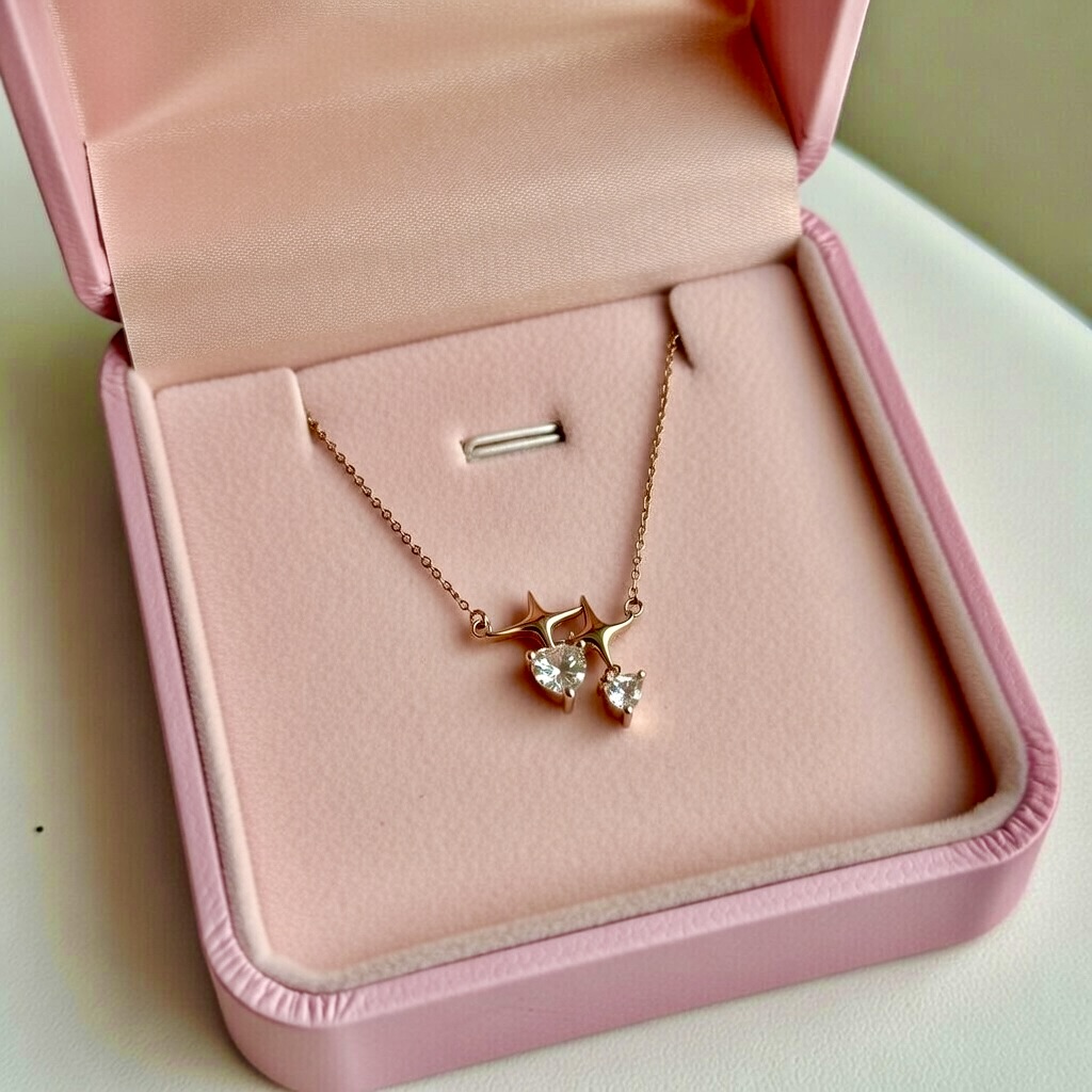 A delicate gold chain adorned with two shimmering stars and heart-shaped gemstones, offering a perfect blend of elegance and charm. This romantic piece is ideal for everyday wear or special occasions, adding a subtle sparkle to any outfit.